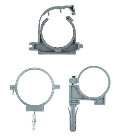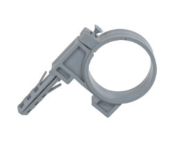 Пластиковый зажим D 32 — D 110 состоящий из двух половинок с дюбелем и саморезом в комплекте, предназначенный для крепления труб , обеспечивающий их установку на горизонтальную и вертикальную плоскость.